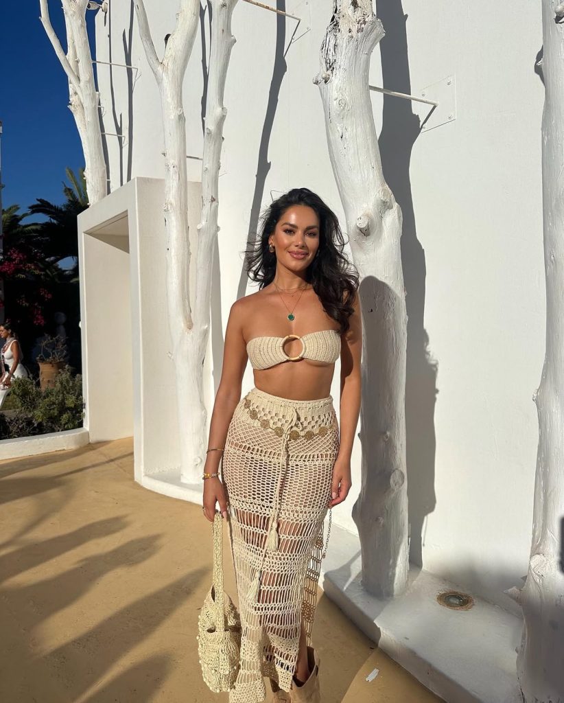 Nothing says effortlessly stylish like a crochet skirt set with a bandeau top. The earth-toned hues, woven textures, and golden accessories make this the perfect Ibiza-inspired beach look. Pair it with a woven tote bag, and you’re ready for an oceanside escape. You can get this beach outfit online from mermaids-swimwear.com.