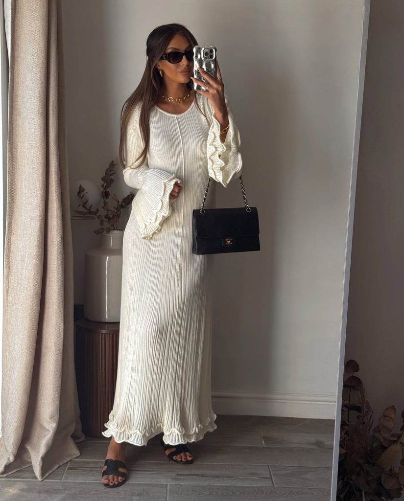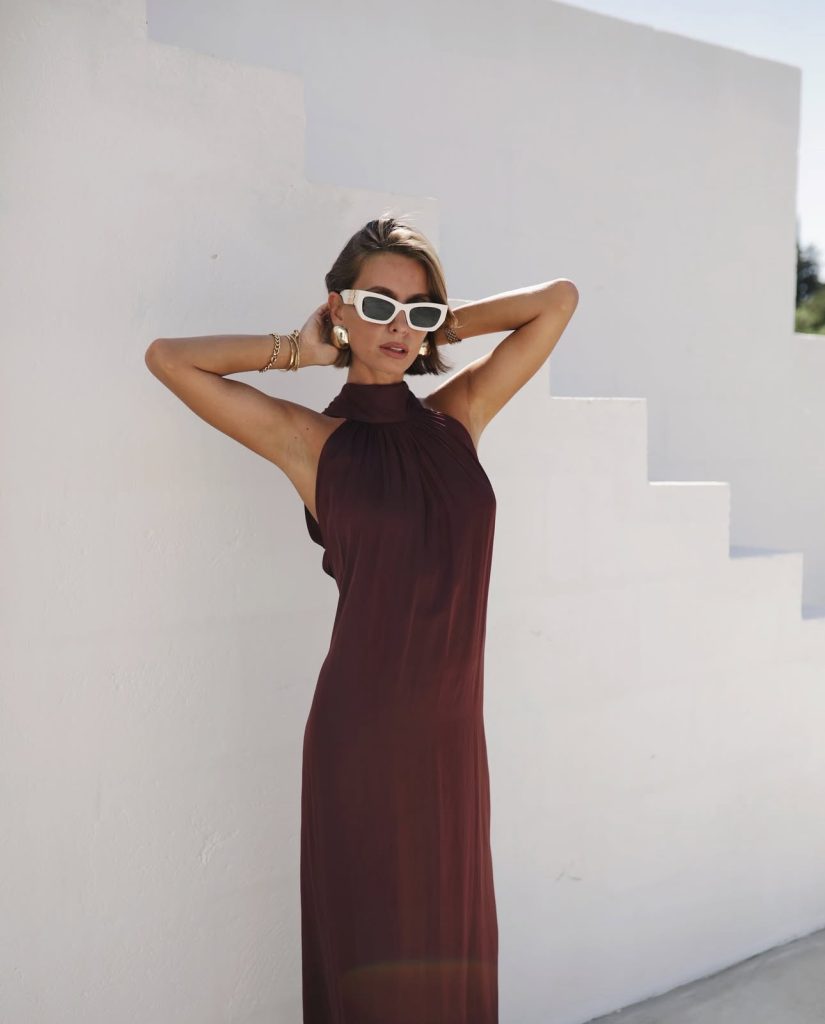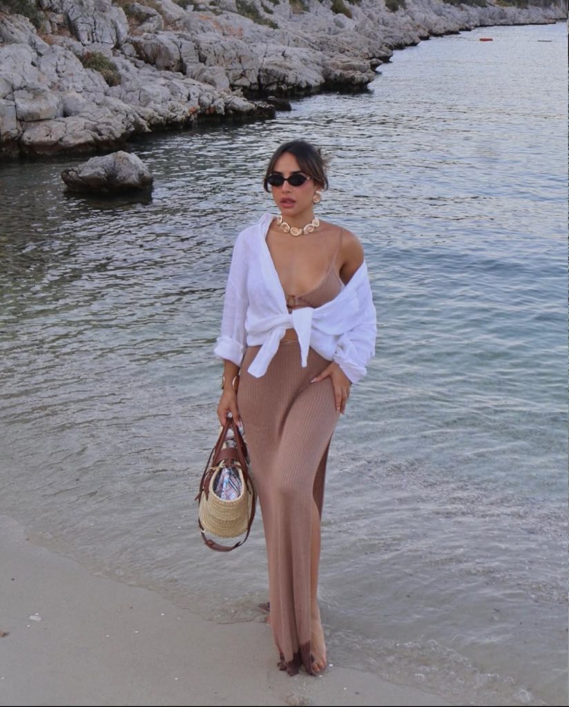A neutral-toned maxi dress with a simple tie-front white shirt is the perfect balance of relaxed and polished. The gold shell necklace adds a touch of elegance, while the oversized sunglasses give it an air of mystery. Whether you’re heading to a beachside café or lounging by the waves, this is an effortlessly glamorous coastal look.