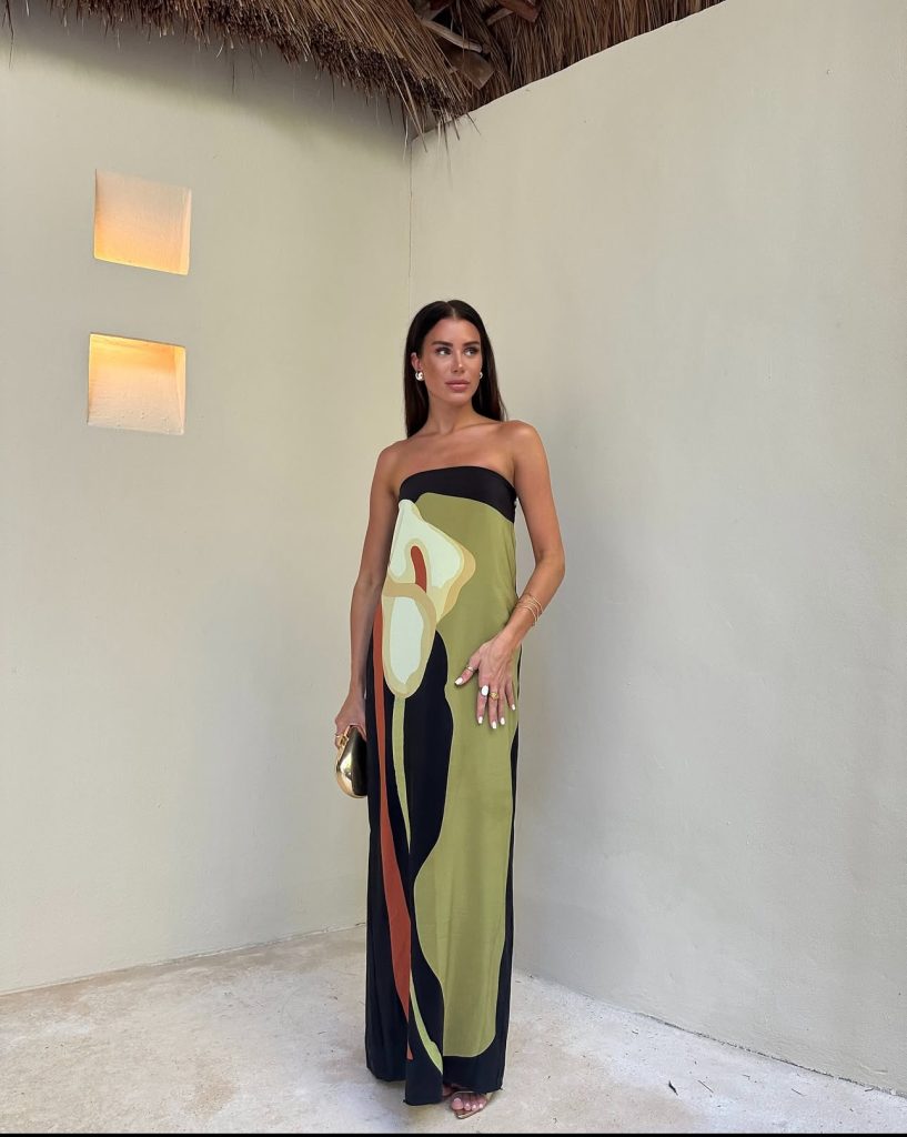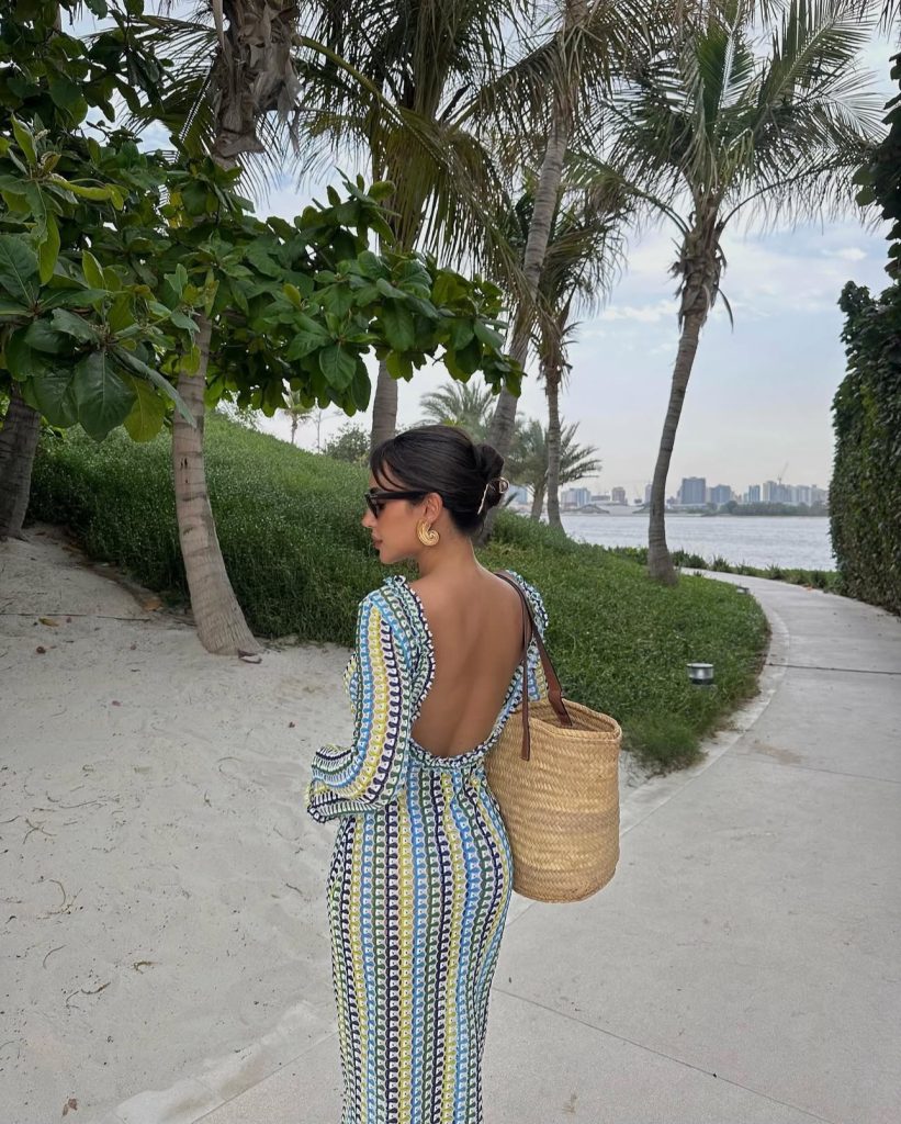 This backless patterned maxi dress is giving high-end vacation vibes. The flowing silhouette and bold print make it stand out, while the straw tote bag keeps it relaxed and functional. The perfect outfit for a luxury getaway or a stylish stroll along the shore. You can get this beach outfit online from www.shop-thegoldenhour.com.