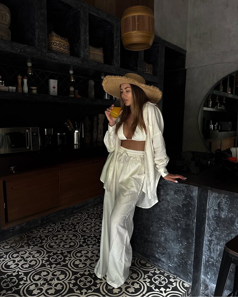 A white oversized linen set paired with a bikini is the ultimate laid-back beach uniform. The wide-leg pants and breezy button-down make this look both comfortable and effortlessly cool. Add a wide-brimmed straw hat, and you’re all set for a chic beachside brunch.