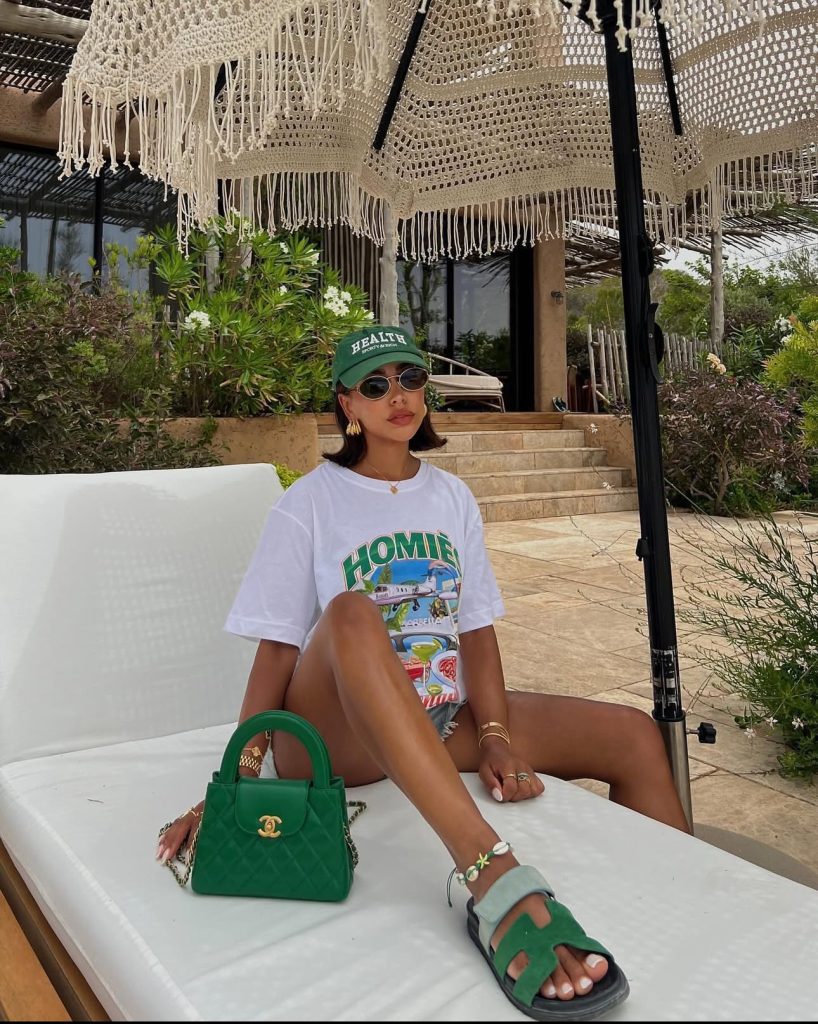 Beach day, but make it street style. A graphic tee, relaxed shorts, sporty sandals, and bold accessories give this outfit a casual yet trendy edge. The pop of green from the designer handbag and cap makes it a playful yet polished beachside look.