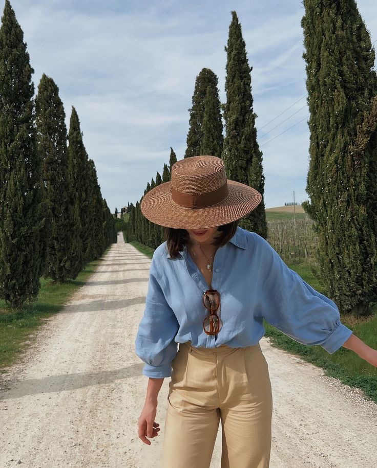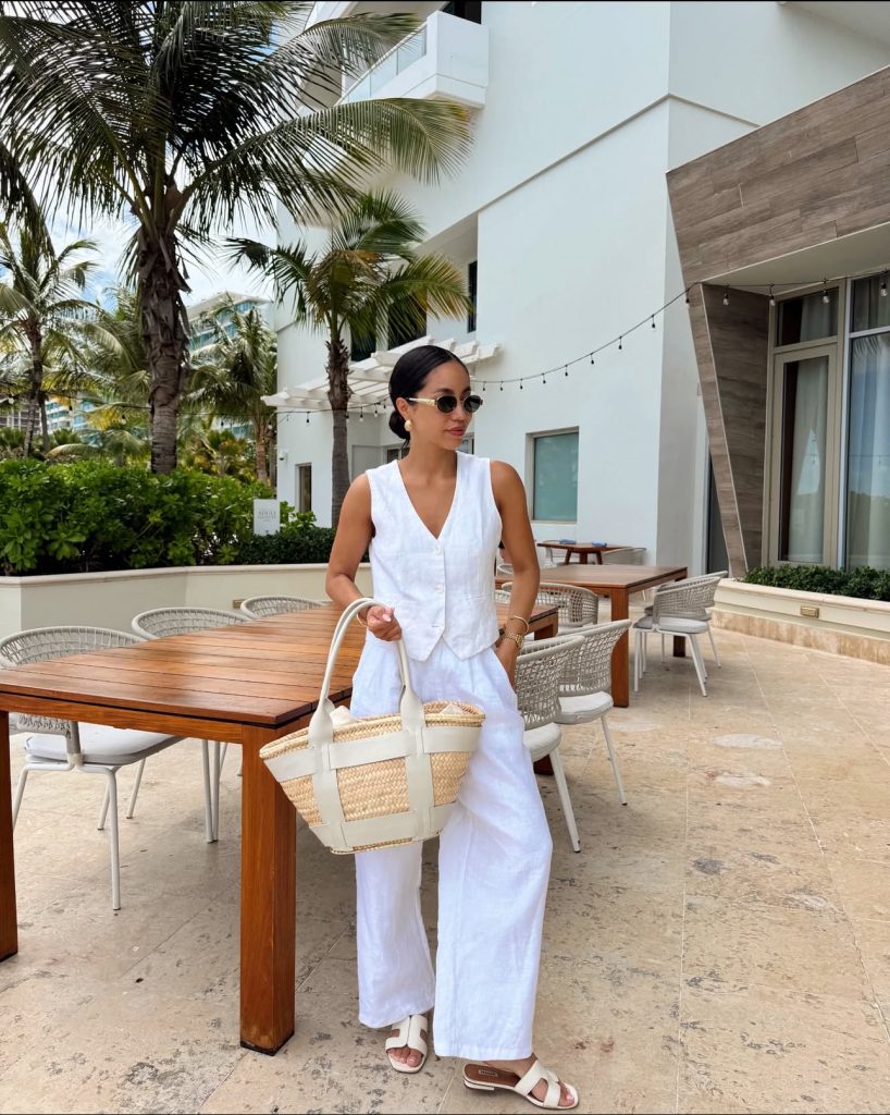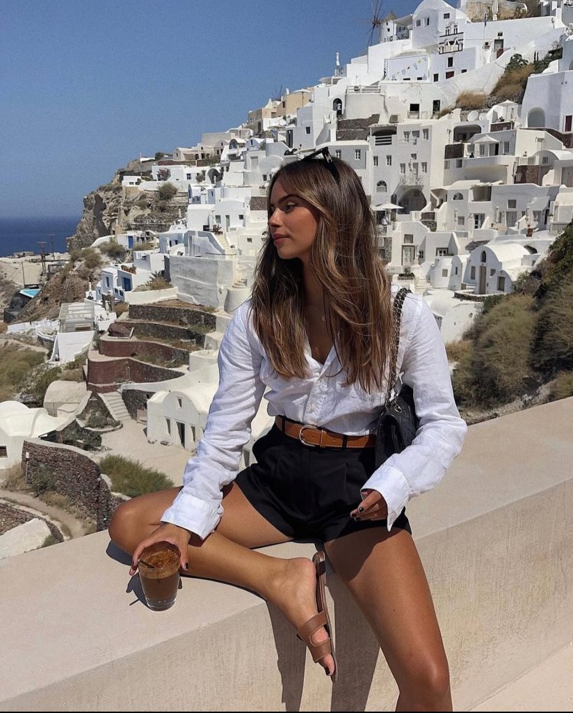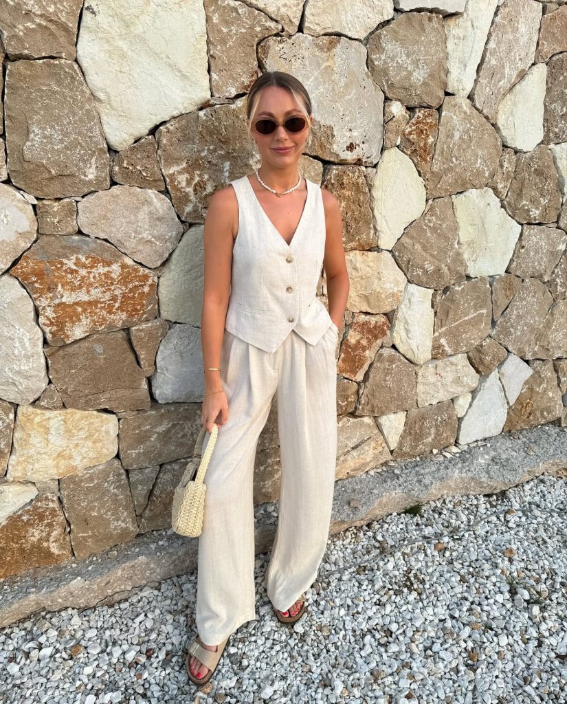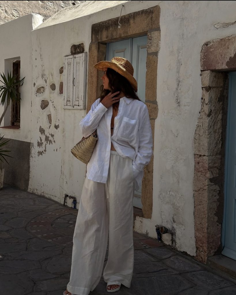 If you’re going for the ultimate relaxed yet stylish vacation look, a linen-on-linen outfit is a must. A slightly oversized white button-up, tucked into airy wide-leg trousers, exudes effortless charm. Paired with a woven hat and sandals, this look is perfect for exploring historic Greek streets or grabbing a leisurely brunch by the sea.