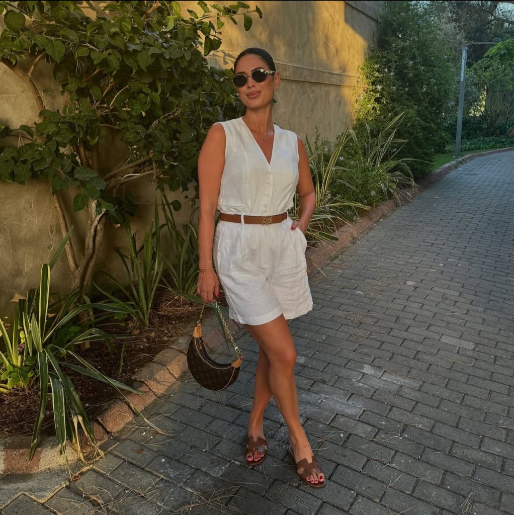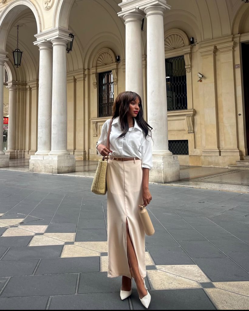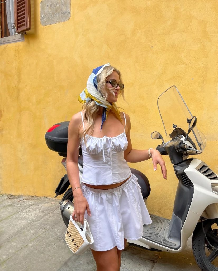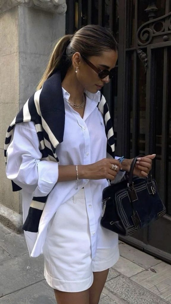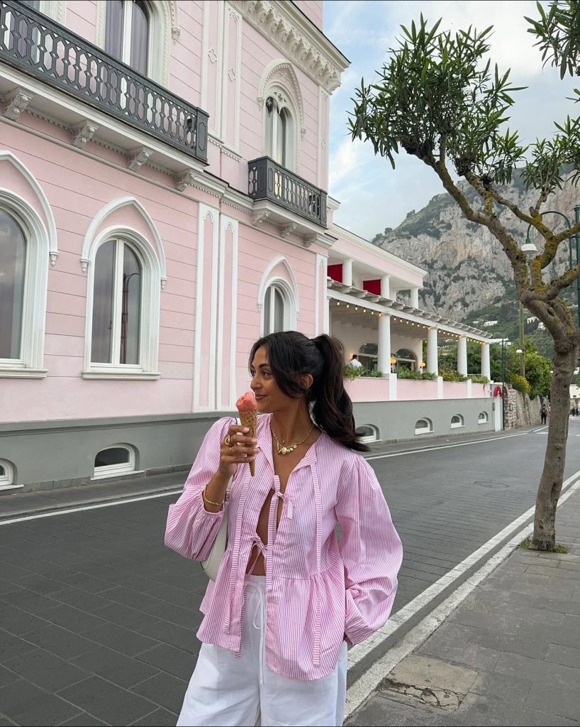If you’re going for the ultimate relaxed yet stylish vacation look, a linen-on-linen outfit is a must. A slightly oversized white button-up, tucked into airy wide-leg trousers, exudes effortless charm. Paired with a woven hat and sandals, this look is perfect for exploring historic Greek streets or grabbing a leisurely brunch by the sea.