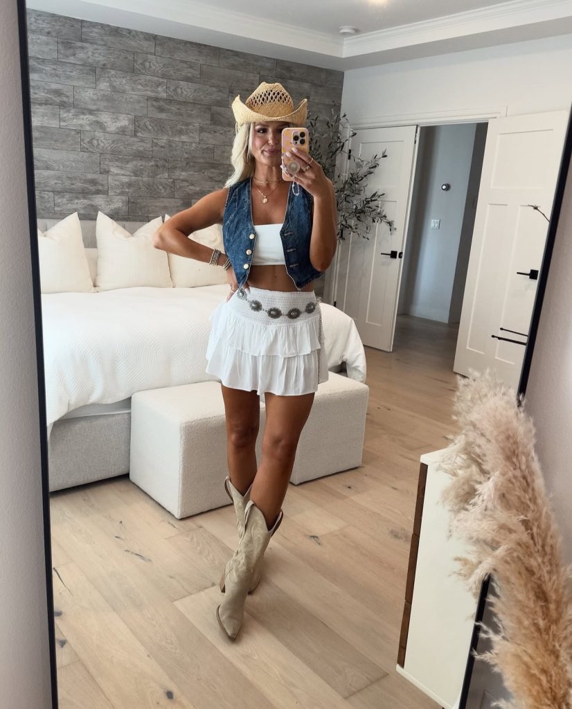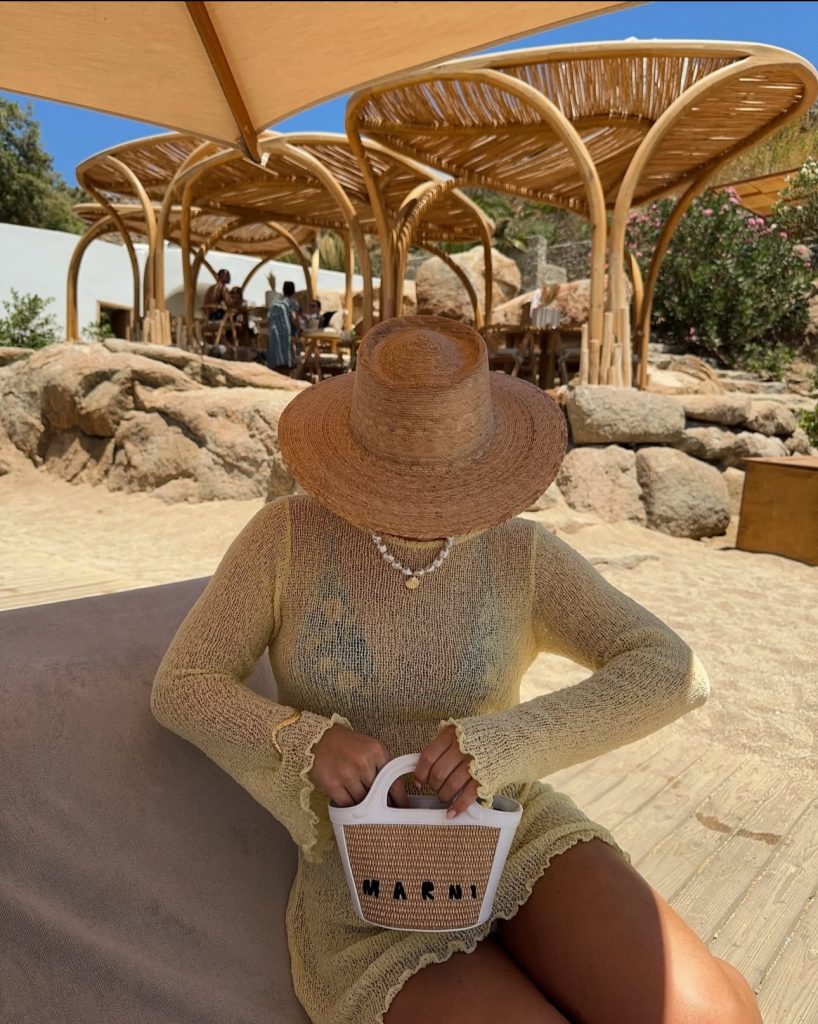 A white bikini and mesh mini skirt combo with a wide-brim hat is old-money beach glamour at its finest. The oversized sunglasses and woven bag add a vintage touch, making this the perfect elevated beach club look.