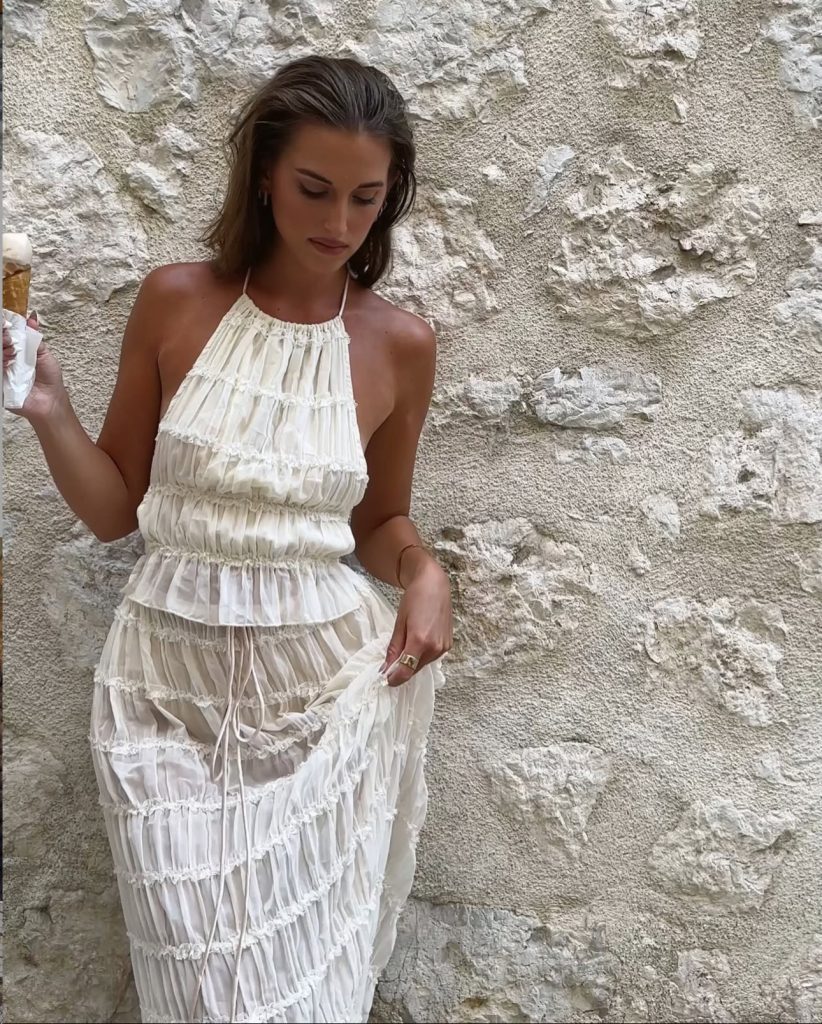 A ruffled two-piece with delicate tie details is effortlessly romantic and perfect for a European summer escape. The earthy accessories, soft waves, and golden hour lighting make this outfit feel straight out of a postcard. You can get this beach outfit online from www.selfieleslie.com (the Maidens Tie Set).