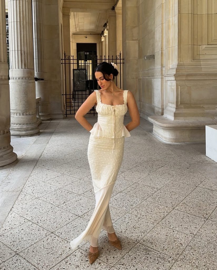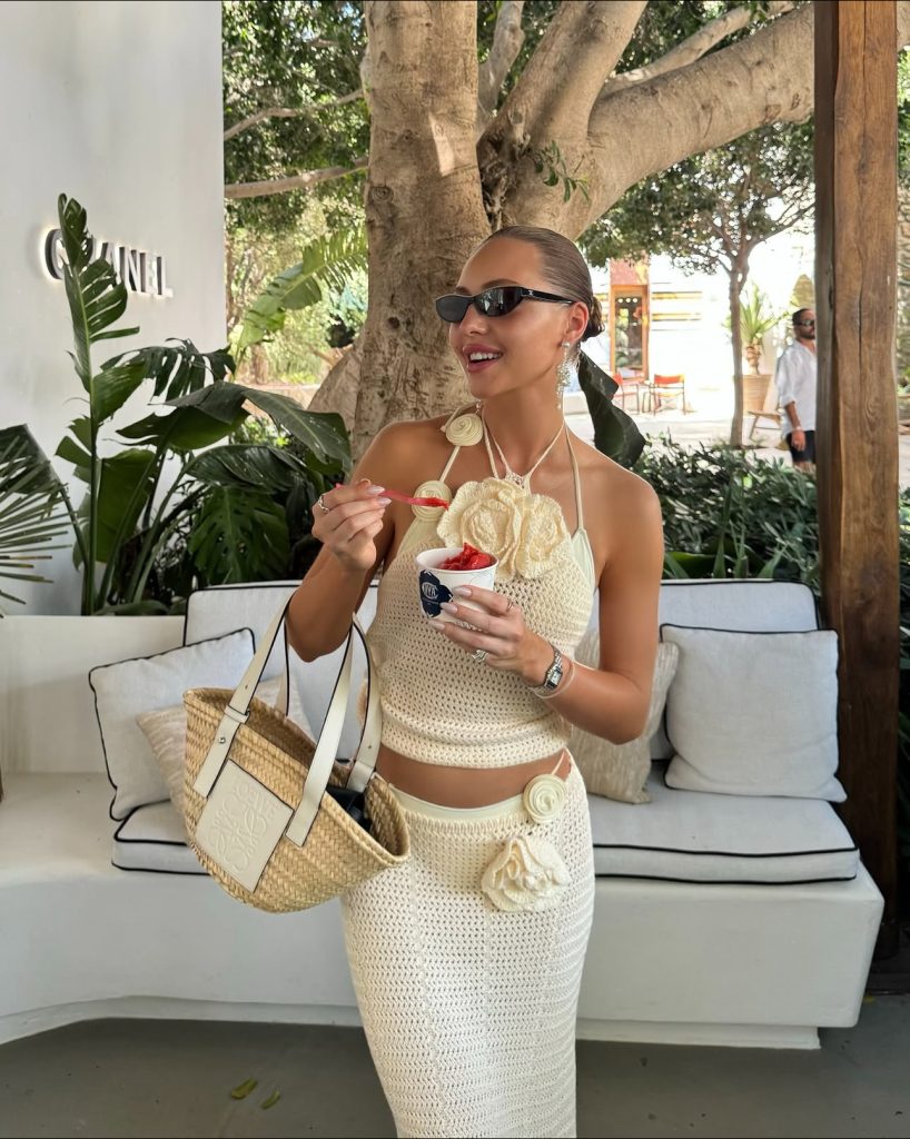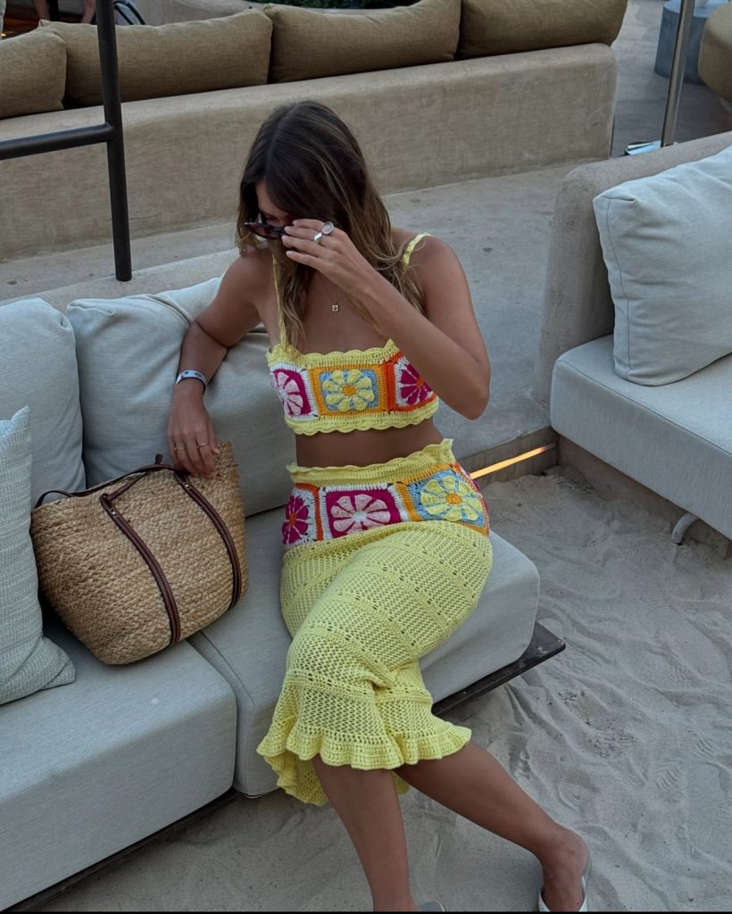A crochet two-piece set? Yes, please! This dreamy, handcrafted look is perfect for a laid-back brunch in a chic beach café. The intricate floral details and neutral tones blend beautifully with the Mediterranean aesthetic. Complete the look with a woven tote and some cat-eye sunglasses for an effortlessly luxe vibe.