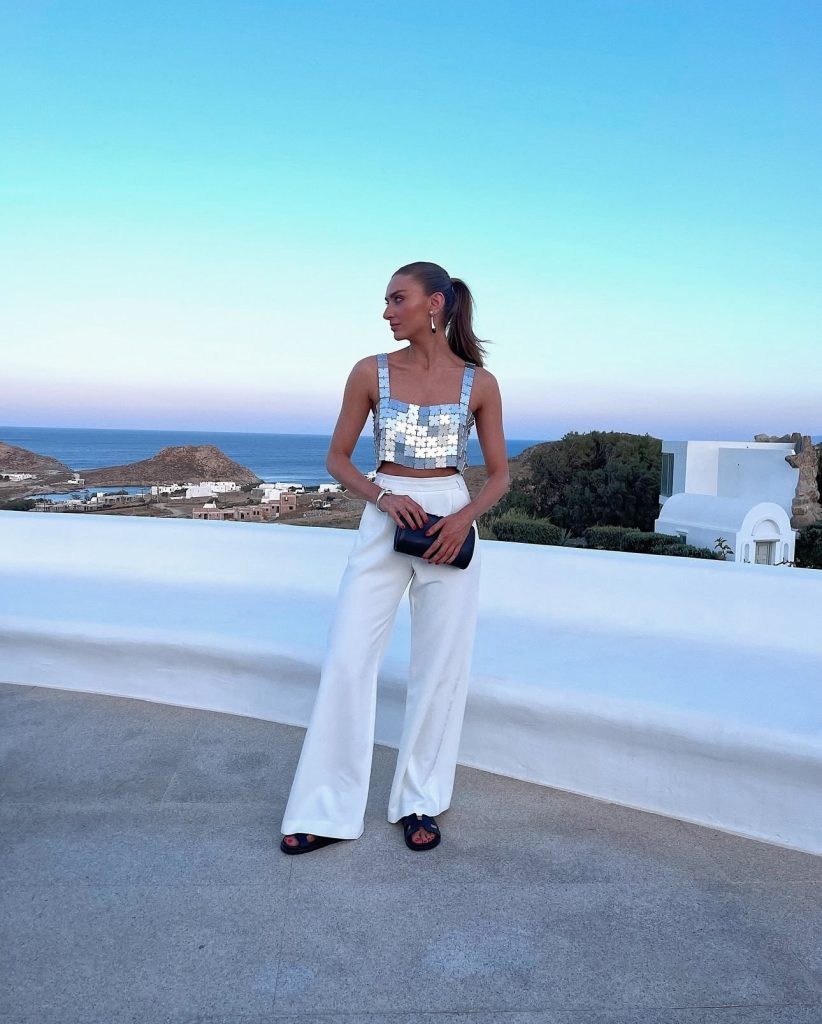 For a dreamy evening look, this 3D floral crop top paired with wide-leg neutral trousers is everything. The soft, structured petals add a delicate, feminine touch, while the neutral bottoms balance out the look perfectly. Whether you’re sipping wine at a taverna or walking along the coast, this outfit is sure to turn heads.