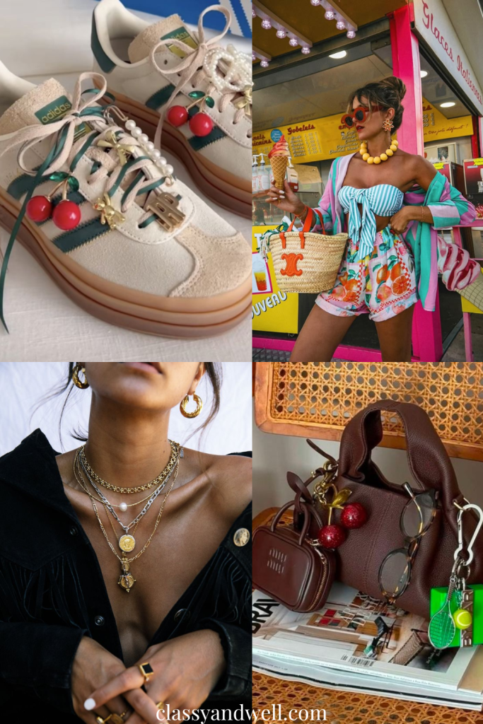 Minimalism? Never heard of her. 2025 is all about layering on the extras—charms, bows, beaded keychains, chunky rings, stacked bracelets, and even sneaker accessories. Think of it as maximalist self-expression, where every trinket tells a story. The it-girls are piling on bag charms and personalizing everything, from hair bows to shoes. And yes, even your everyday tote deserves a little bling.