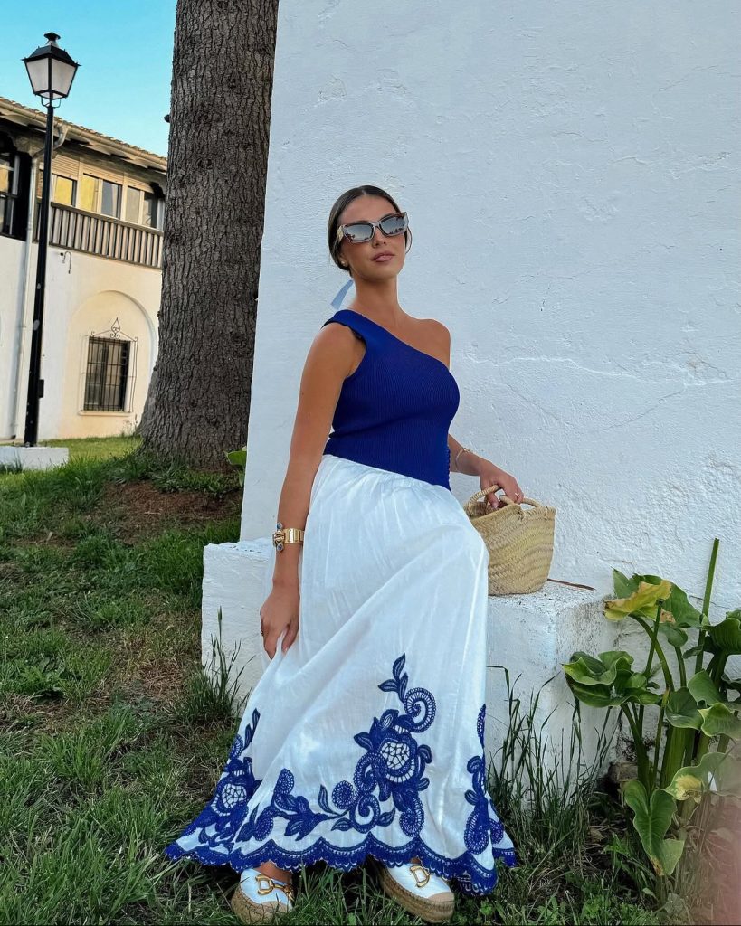 A little bit bold, a little bit classic—this one-shoulder royal blue top paired with a white embroidered skirt is a stunning nod to Greece’s signature color palette. Perfect for a sunset stroll or a stylish dinner, this look is both relaxed and refined. Add some statement sunglasses and a straw tote for the ultimate vacation-ready outfit.