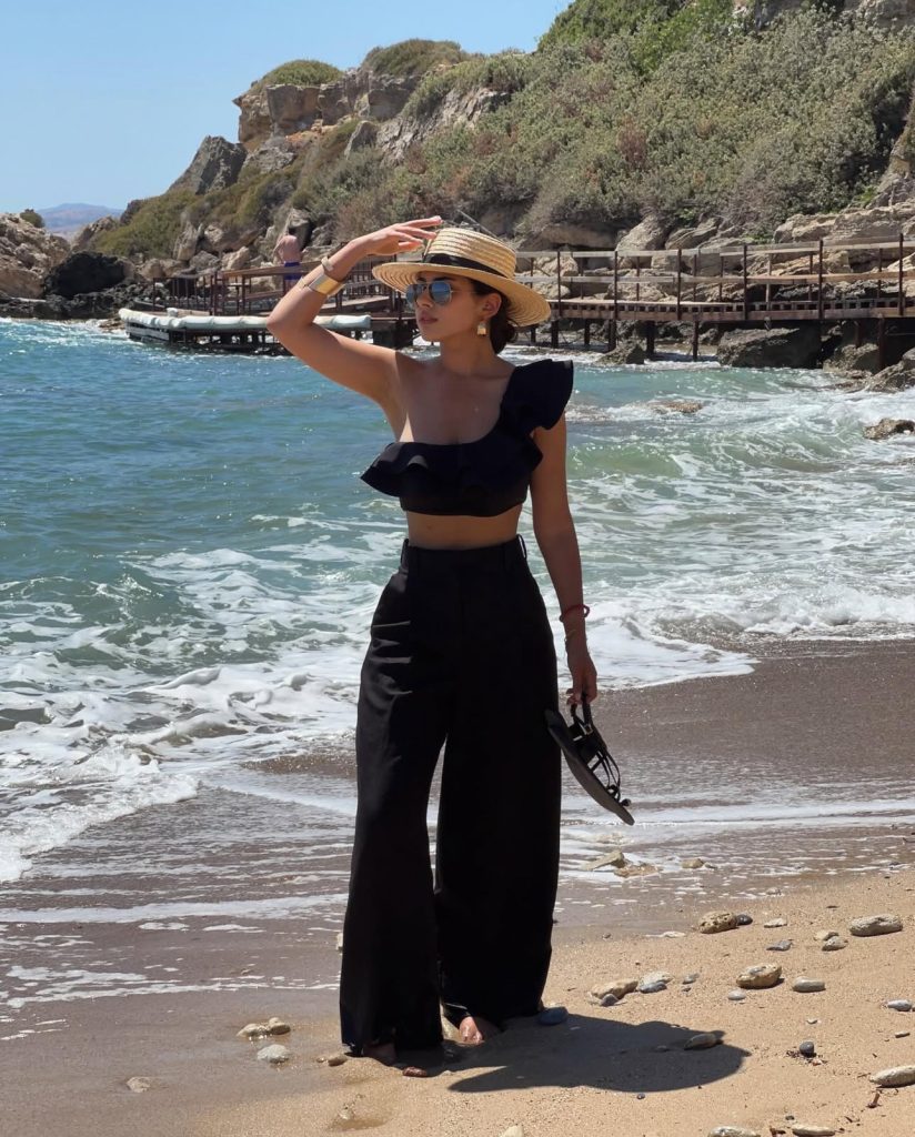 For a chic yet laid-back beachside look, go for an all-black ensemble that radiates sophistication. This ruffled one-shoulder crop top paired with flowy, wide-leg pants is perfect for a seaside lunch or a scenic coastal walk. The straw hat and sunglasses add the perfect finishing touch—effortlessly stylish while keeping the sun at bay.