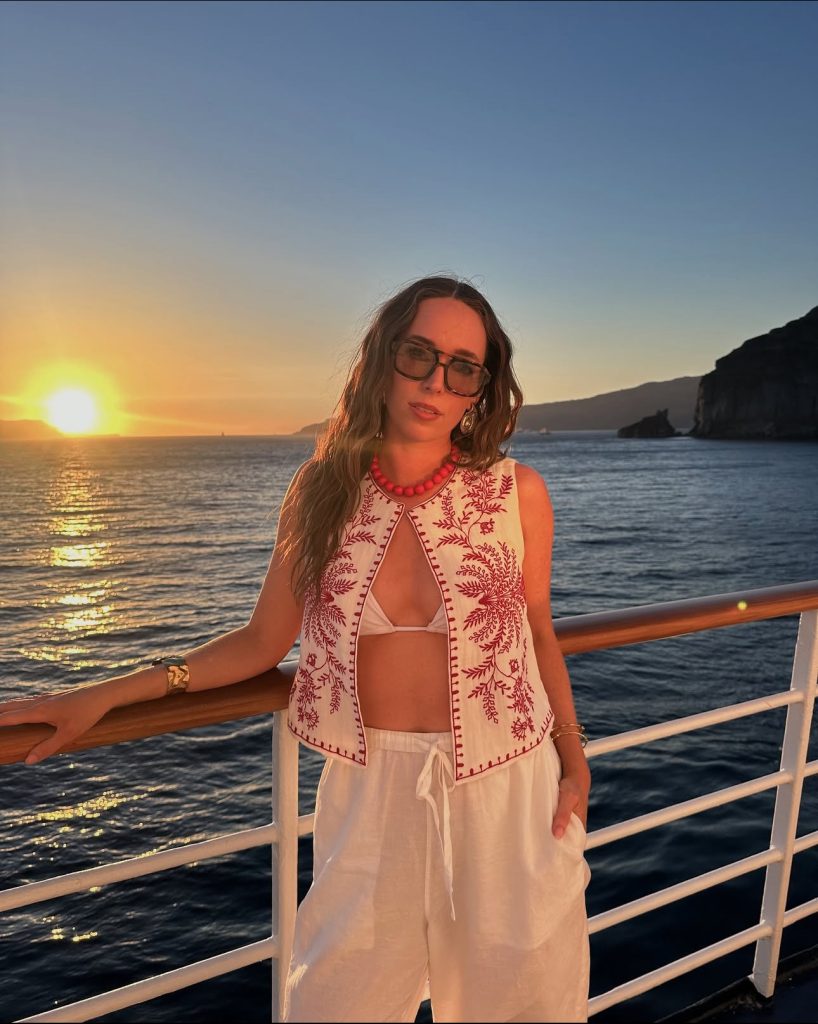 There’s nothing better than a lightweight, breathable outfit for a sunset sail. This embroidered vest layered over a bikini top gives off effortless vacation vibes, while the crisp white linen pants add a touch of elegance. The bold red necklace ties it all together, making this the perfect yacht-ready look.