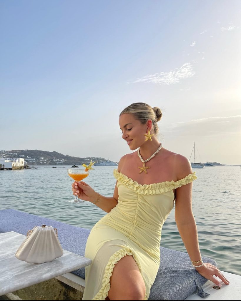 Golden hour in Mykonos calls for a soft pastel moment! This off-the-shoulder, ruffled yellow dress is the definition of effortless glam. The ruched detailing adds a flattering touch, while the starfish earrings and shell accessories give it the ultimate beachside cocktail vibe. Wear this for a romantic dinner by the water or a sunset cruise around the island.