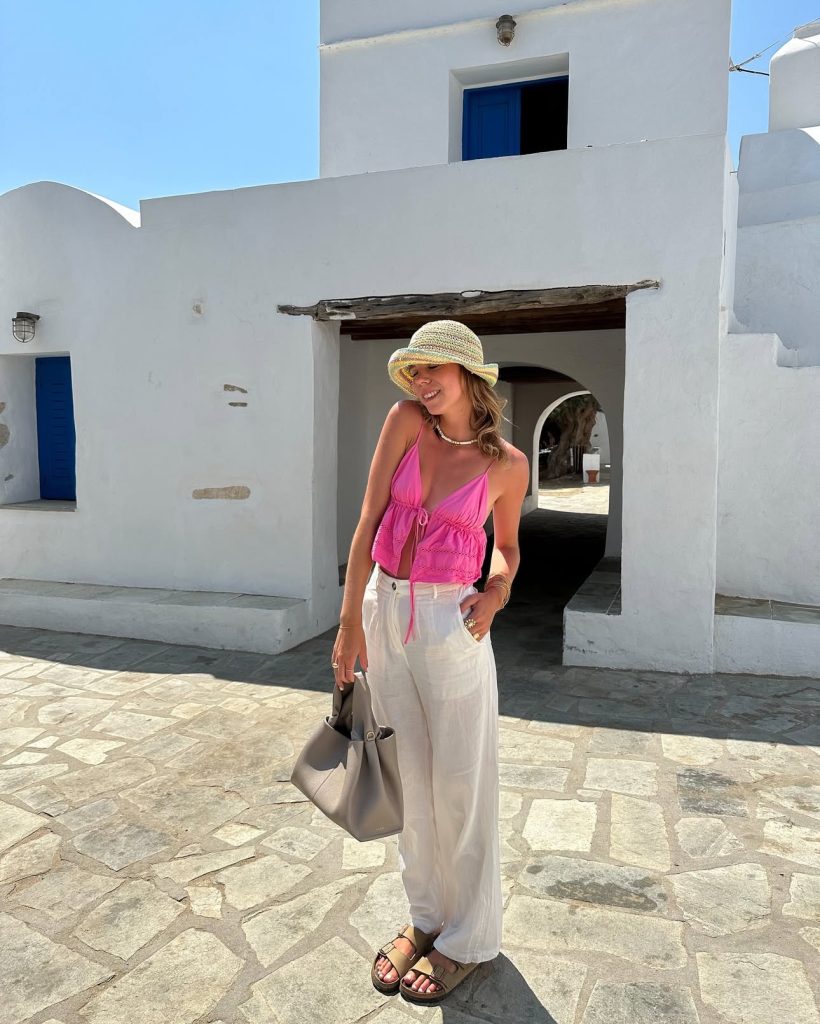For those days spent exploring charming Greek villages, a lightweight, airy outfit is a must! A bright pink crop top adds a playful pop of color, while the white linen pants keep things cool and comfortable. Add a woven sun hat and some comfy sandals, and you’re ready for a day of boutique shopping and café hopping!