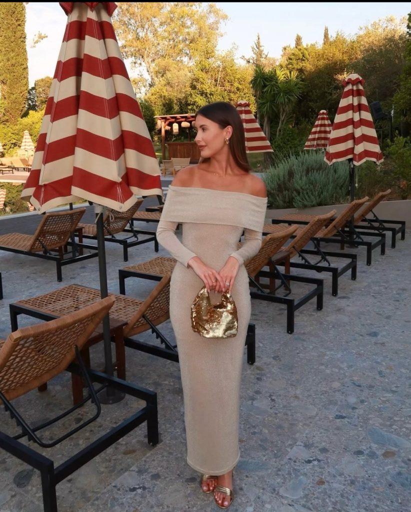 For a luxe dinner date or a glamorous evening out, this shimmering off-the-shoulder maxi dress is pure perfection. The body-hugging silhouette paired with gold accessories gives a sophisticated yet effortless vibe. Just add some statement earrings and a sleek hairstyle for that goddess-like glow.