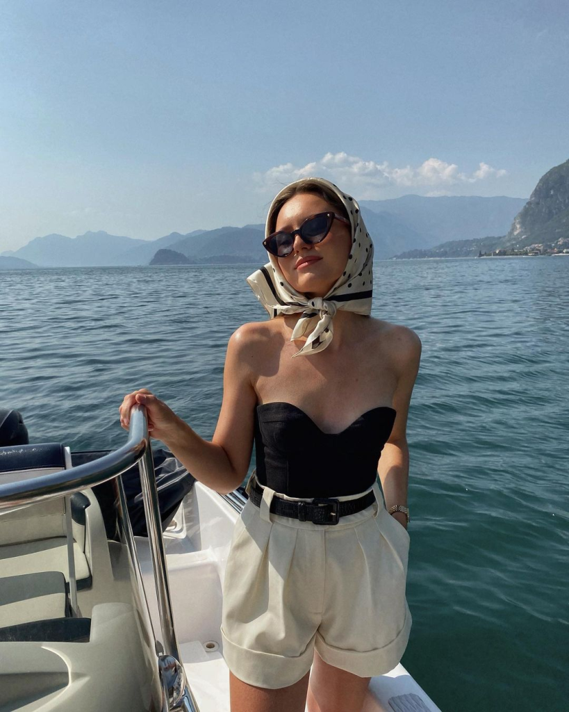 A black and white color palette never goes out of style. The striped headscarf, flowy linen layers, and oversized sunglasses give this outfit an effortlessly sophisticated feel, perfect for lounging on a yacht or exploring the coast.