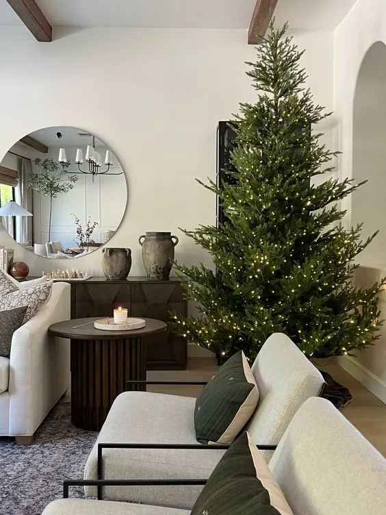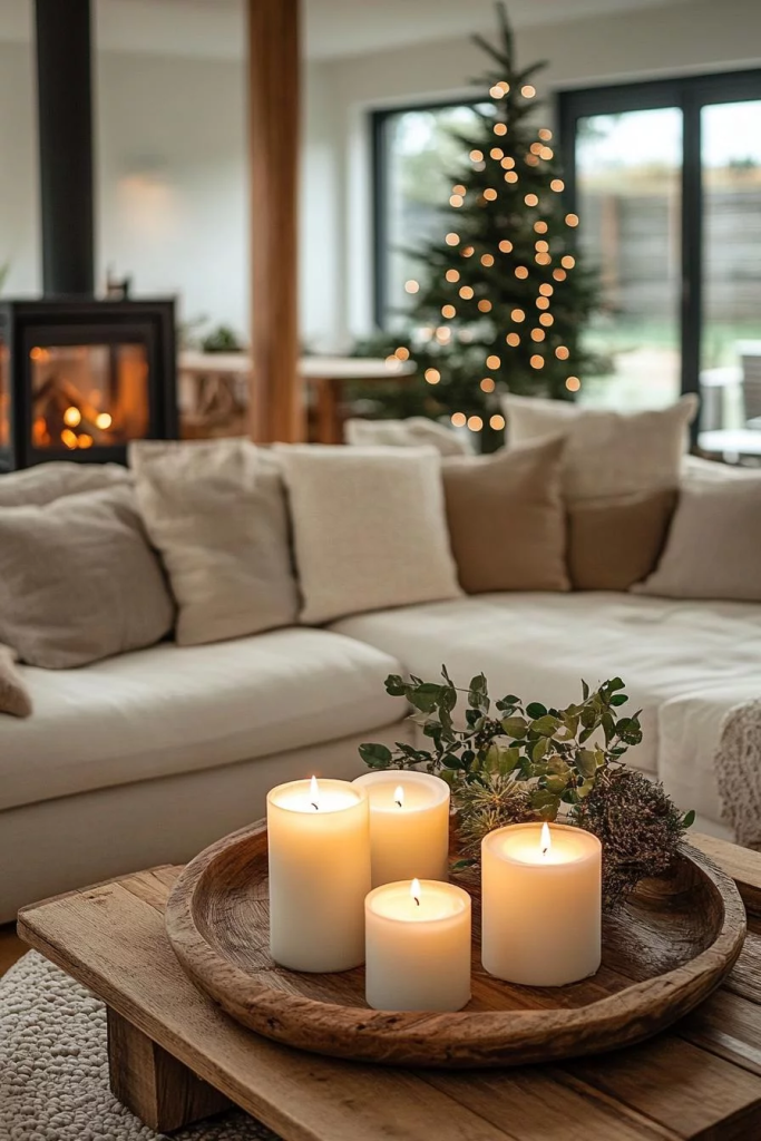 This living room is giving major vintage holiday vibes with its candlelit tree and rustic mantel decor. The earthy tones, simple ornaments, and flickering candlelight evoke a cozy, old-world charm that’s perfect for the season. It feels like a scene straight out of a classic Christmas tale.