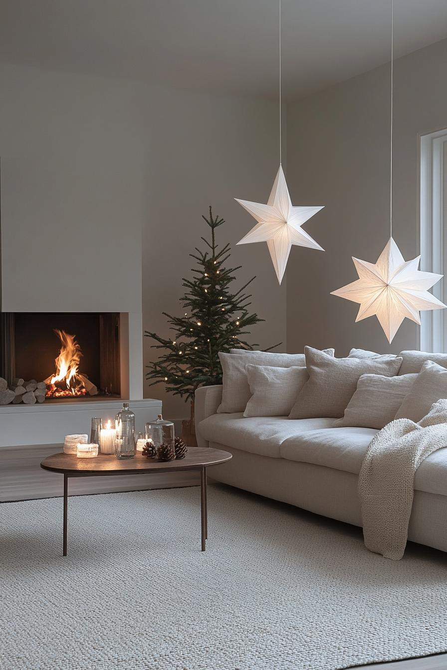 This setup makes me feel like I’ve stepped into a warm holiday retreat. The garland with its vintage ribbon and delicate star details drapes so perfectly over the rustic stone fireplace. And those tapered candles give the room a beautiful, soft glow. I can just imagine curling up here with a mug of hot cocoa while the lights twinkle on the tree!
