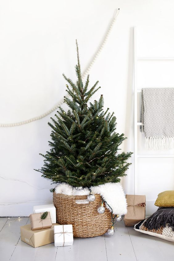 A simple yet charming touch of greenery! This little corner is decked out with a rustic pine tree in a beautifully textured pot, adding a natural element to the holiday decor. It’s understated, chic, and ideal for a cozy nook by the fireplace or your Christmas tree.