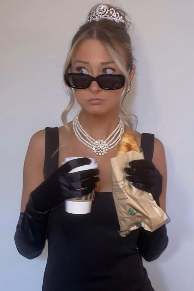 This DIY costume is inspired by the iconic film “Breakfast at Tiffany’s.” It features one of Audrey Hepburn’s most memorable looks: the classic black dress.
