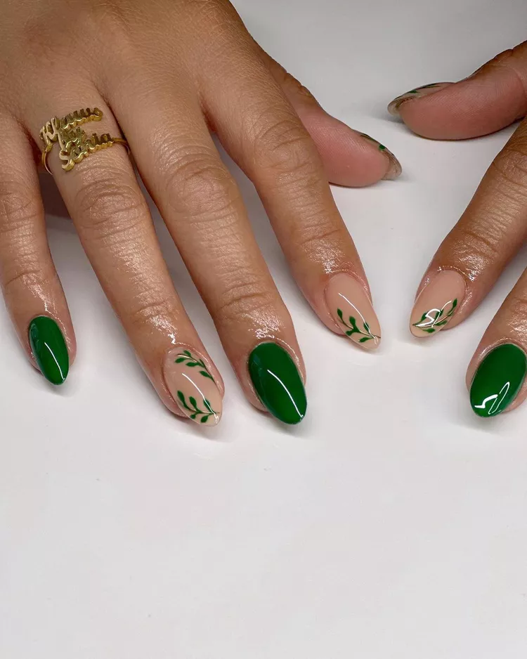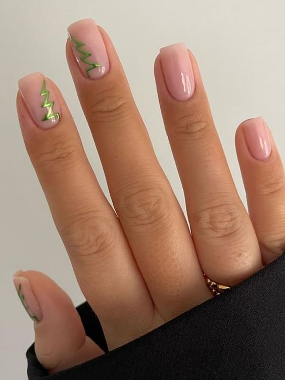 This nail design is all about those earthy, cozy vibes! The deep forest green swirls against the nude background create such a modern, chic look, perfect for the winter season without being too on-the-nose with holiday themes. It’s a great choice for someone who wants a unique, fashion-forward design that still feels warm and festive. Pair this with your favorite gold accessories, and you’ve got a stunning, elevated winter look!