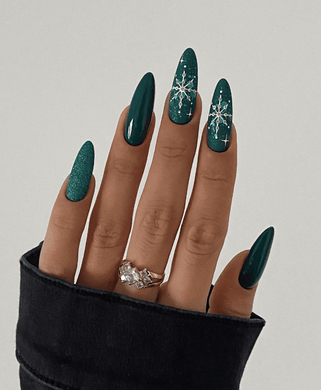 These deep emerald nails bring a sophisticated twist to your Christmas look. The rich green color is both festive and classy, while the intricate white snowflakes add a touch of seasonal charm. The subtle sparkle on a few nails makes it feel like a winter wonderland without being over-the-top. This design is perfect for someone who wants to embrace the holiday spirit in a more refined, elegant way. Perfect for a chic Christmas dinner or a stylish holiday event!
