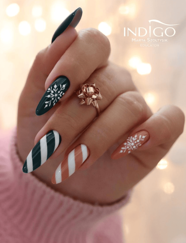 This festive nail set feels like a cozy winter wonderland! With its classic snowflakes and candy cane stripes, it’s a perfect balance of playful and elegant. The deep green and warm terracotta give off that seasonal vibe without being too traditional, making it great for someone who loves mixing holiday fun with a bit of sophistication. This design will have you feeling festive whether you’re sipping hot cocoa or dressing up for Christmas!
