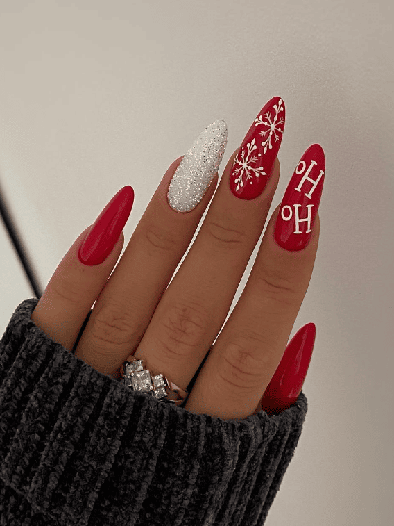 These vibrant red nails are the epitome of festive fun, featuring playful details like a snowy white glitter accent nail, delicate snowflakes, and a cheerful “Ho Ho” design. The combination of bold red and crisp white gives off classic Christmas vibes, while the glitter adds a touch of holiday sparkle. It’s the perfect set for someone who loves to fully embrace the holiday spirit with a chic yet playful twist.