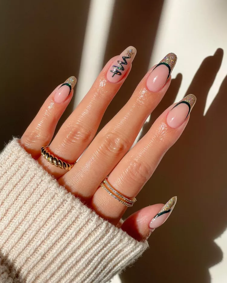 This design screams elegance with a dash of holiday sparkle! The double tip gives a sophisticated edge with a shimmery gold outer layer that catches the light just right, while the inner black tip adds a bold contrast. And to top it off, a beautifully drawn Christmas tree on one nail ties in that festive charm without going overboard. It’s perfect for anyone who loves a classy, yet fun look for the holidays!