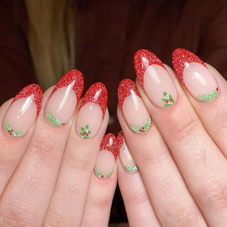 The subtle holly and evergreen designs near the cuticles add just the right amount of Christmas spirit without overpowering the sparkling tips. It’s the perfect combination for anyone looking to embrace the holiday season with a mix of glam and charm.