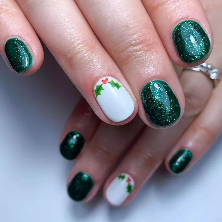 This festive design brings all the holiday cheer! The rich, glittering green nails feel like twinkling Christmas lights, while the white accent nails with cute holly sprigs add a playful, seasonal touch. It’s a classic holiday look with a bit of shimmer, perfect for those who want a fun yet elegant way to show off their Christmas spirit!