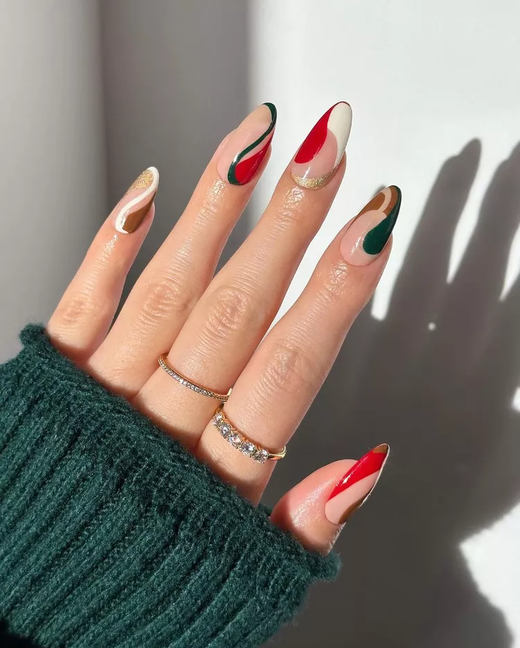 Oh wow, these nails just make me want to snuggle up in a cozy sweater and watch the snowfall! Each nail paints a perfect picture of the holiday spirit, don’t you think? The swirls of red and green on a white base are so elegantly done, and that gold accent? Just the right amount of sparkle to light up any festive gathering. Imagine pairing these with a sparkly gold dress at your next holiday event—total showstopper!