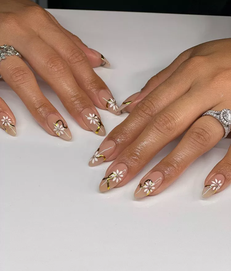 7. Neutral Nails with White Daisy and Gold Ribbons