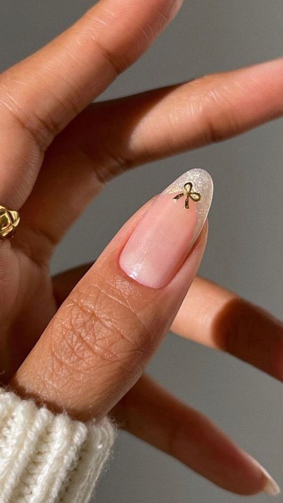 This one’s for the minimalist girlies who love a touch of elegance without the fuss. The soft, translucent base paired with a delicate glittery French tip is subtle yet stunning, while the tiny gold bow adds just the right amount of festive charm. It’s the perfect design for those who want something understated but still want to feel a little holiday magic on their nails. Simple, sophisticated, and effortlessly chic!