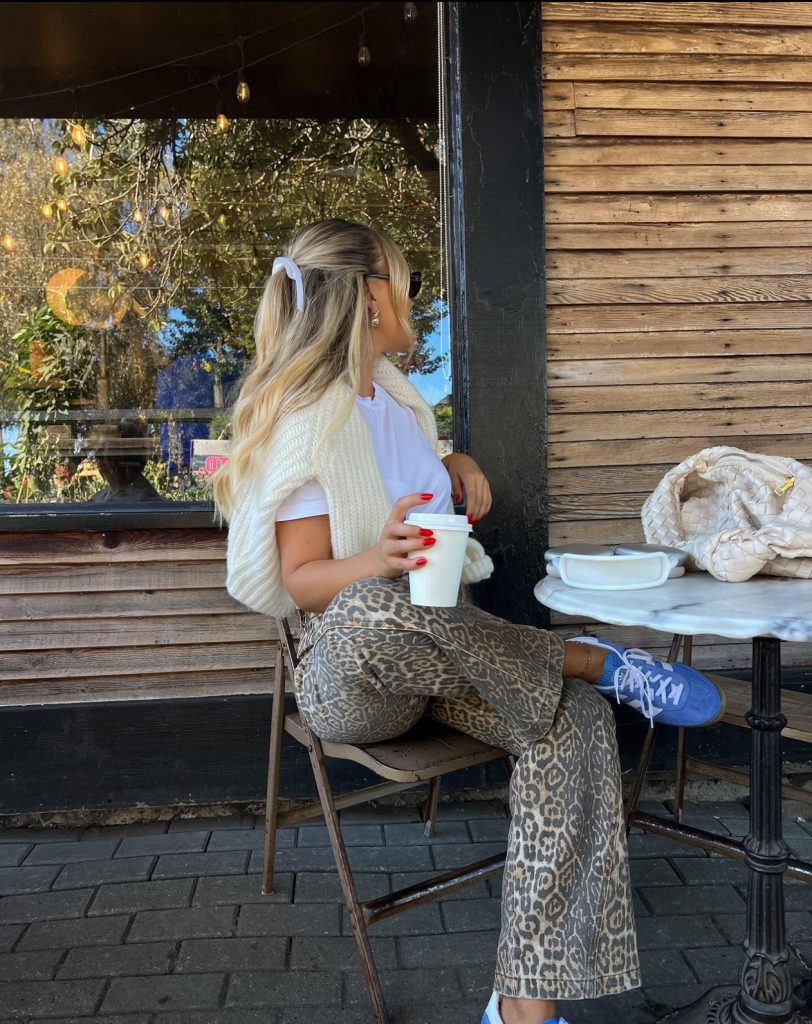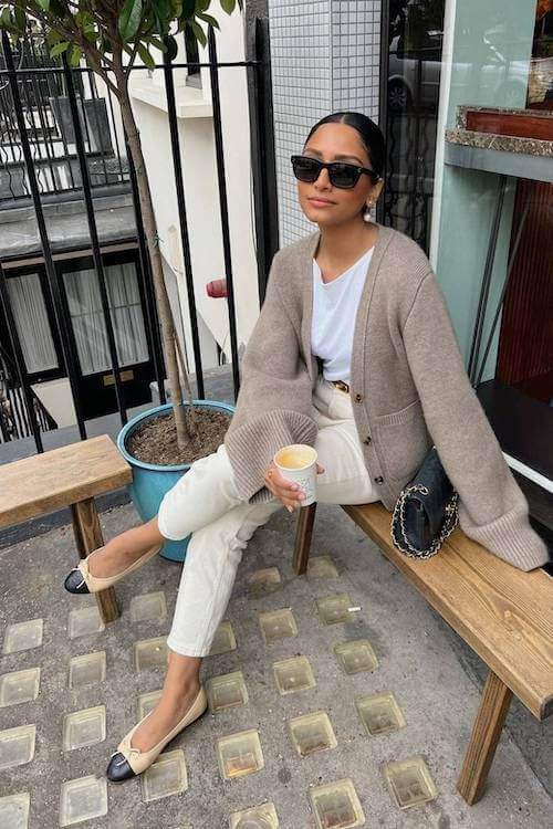 A laid-back yet polished look for casual workdays or coffee runs, this oversized cardigan pairs perfectly with a simple white tee and relaxed white denim. The neutral tones of the cardigan add warmth and coziness, while the two-toned flats keep the outfit stylish and refined. Add a sleek black bag for a chic, minimalist touch—ideal for effortless fall days.