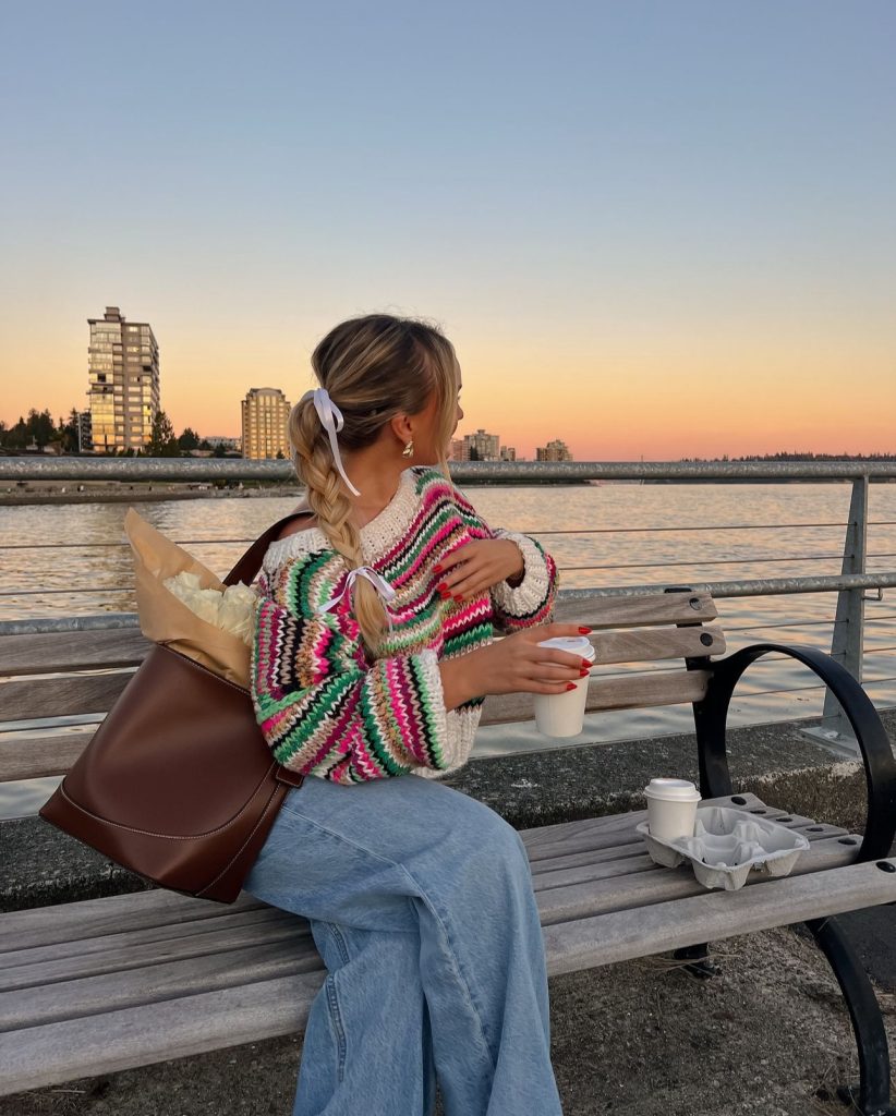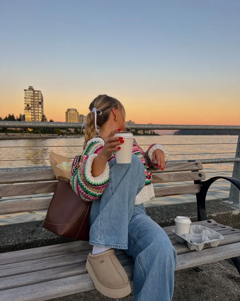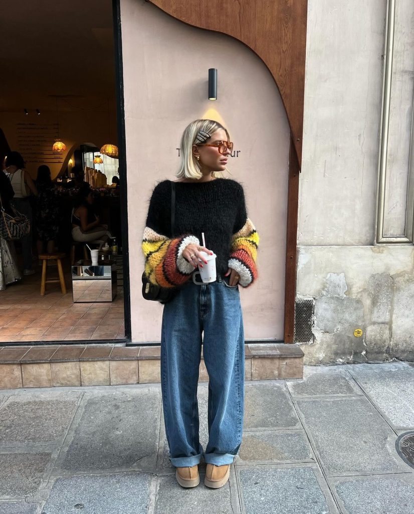 I love the playful vibe of this cozy sweater with its colorful sleeves! Paired with wide-leg jeans and tan UGG slippers, it’s perfect for a relaxed coffee run or a casual day out. The oversized fit makes it extra cozy!