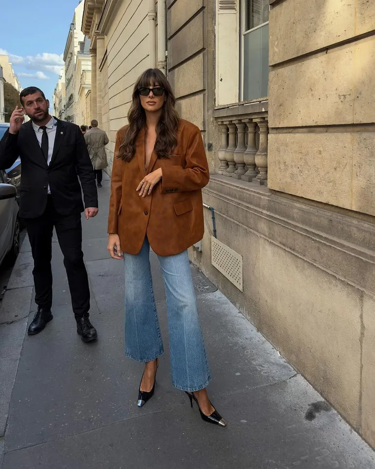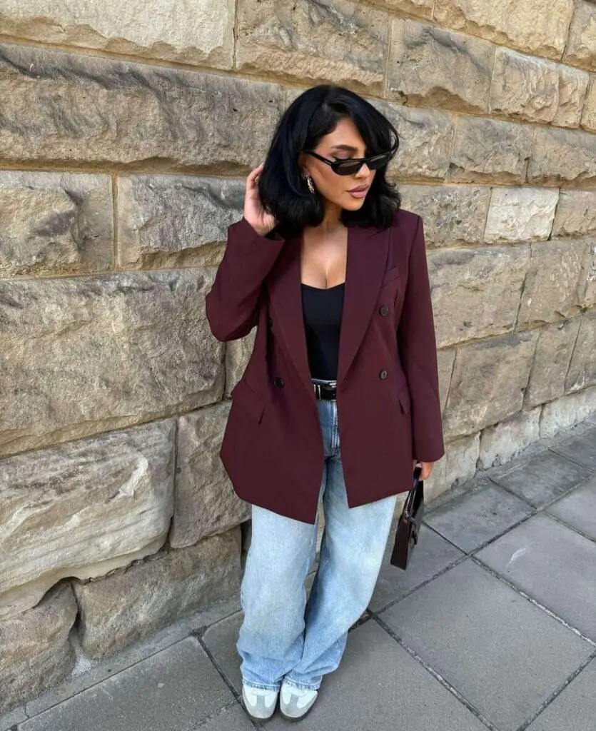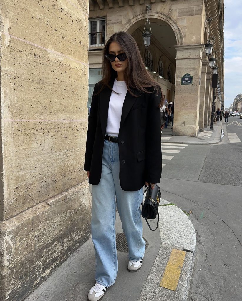 Loafers are the perfect blend of style and practicality, making them a go-to shoe for both casual and elevated looks. In this outfit, the sleek black loafers add a polished touch to the relaxed jeans and blazer combo. They’re ideal for a day of walking around the city or running errands, all while keeping your outfit looking effortlessly chic. Plus, they’re incredibly versatile—you can wear them with just about anything, from trousers to dresses. If you’re looking for a shoe that’s comfortable yet sophisticated, loafers are definitely the way to go!