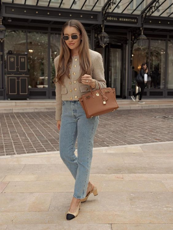This look blends casual comfort with timeless elegance, making it a go-to for a relaxed business casual vibe. The cropped tweed jacket with gold buttons adds a luxe touch, while the light-wash jeans keep it laid-back and effortless. Paired with two-toned heels and a structured brown bag, this outfit is perfect for days when you want to look chic without trying too hard.