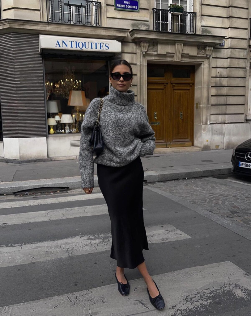 A perfect mix of textures, this outfit pairs a chunky turtleneck sweater with a sleek black satin midi skirt for a chic fall ensemble. The relaxed fit of the sweater contrasts beautifully with the feminine flow of the skirt, creating a balanced and stylish look. Finished with classic flats and a structured shoulder bag, it’s a modern take on business casual that’s both comfortable and effortlessly elegant.