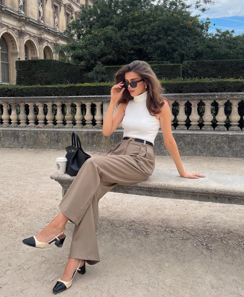 This elegant pairing of a sleeveless white turtleneck and tailored high-waisted trousers is the perfect business casual look for early fall. The neutral tones create a timeless and polished vibe, while the chic two-toned heels add a touch of sophistication. For cooler days, simply throw on a blazer or an open cardigan to show off the sleek turtleneck underneath, effortlessly transitioning this outfit from warm to chilly weather in style.