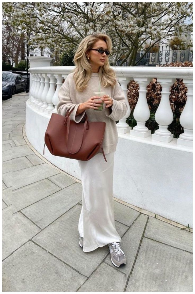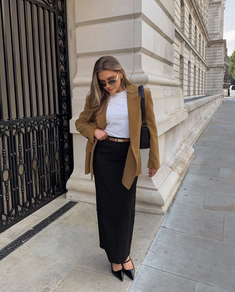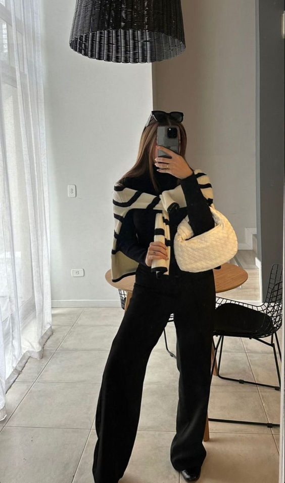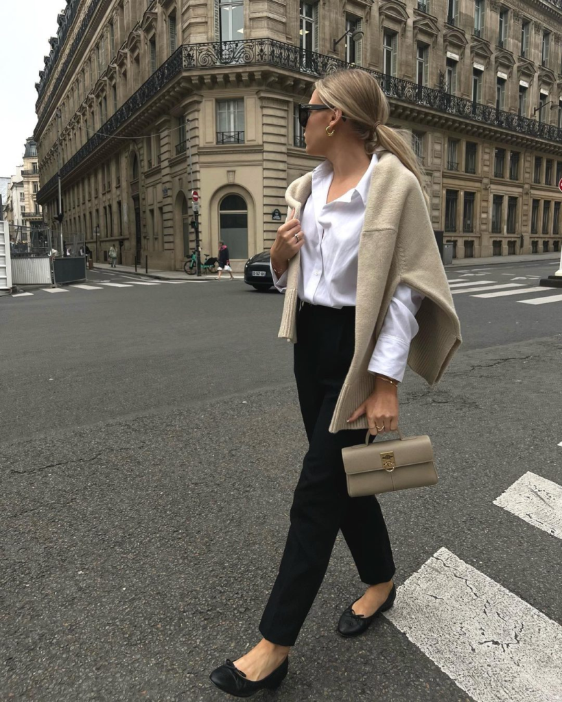 The timeless combination of a crisp white button-down and tailored black trousers makes this outfit effortlessly chic and business-ready. The beige knit draped over the shoulders adds a soft layer of warmth, making it perfect for early fall days. Whether you’re running from meetings to coffee catch-ups, this look is polished yet comfortable. The sleek black flats and structured mini bag keep things sophisticated, while the neutral tones ensure versatility throughout the season.
