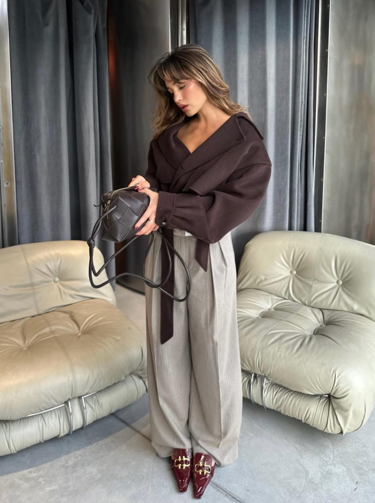 This belted wrap coat exudes understated elegance, perfect for elevating your fall business casual wardrobe. The deep chocolate hue is rich and luxurious, while the wide-leg trousers add a relaxed yet sophisticated balance. The standout element? Those bold burgundy loafers with gold detailing that give a unique, stylish twist. Pair this look with a sleek black bag, and you’re ready to take on the day in comfort and class.