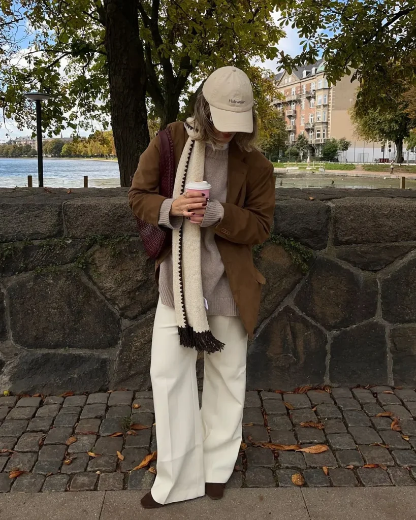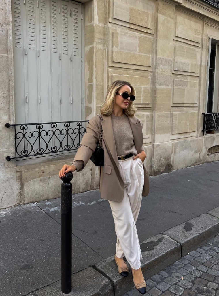 This oversized taupe blazer adds a touch of sophistication to a laid-back fall look. Paired with a cozy knit top and relaxed white trousers, the outfit strikes a perfect balance between comfort and chic. The two-toned shoes and sleek black bag bring it all together for a polished finish, making this look a versatile go-to for both workdays and casual outings.