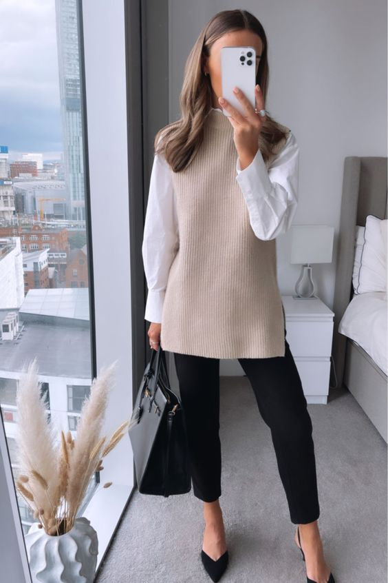 This minimalist look is all about clean lines and simple elegance. The sleeveless beige knit over a crisp white shirt adds dimension and warmth without sacrificing sophistication. Paired with tailored black trousers and sleek pointed-toe heels, this outfit is perfect for a modern business casual wardrobe. The structured black tote completes the look, making it both professional and effortlessly stylish.