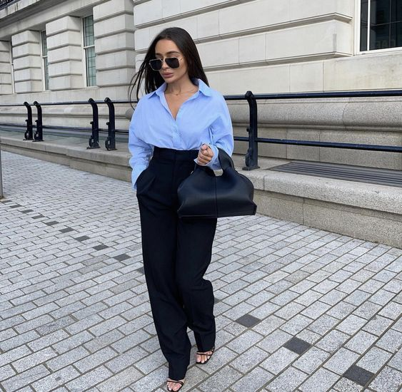This polished look is the perfect mix of classic and contemporary. The light blue button-up shirt tucked into high-waisted black trousers creates a sharp silhouette that’s perfect for a business casual setting. Paired with strappy black heels and a modern, structured handbag, this outfit is effortlessly chic while still maintaining a professional edge. The simplicity of the pieces makes it a versatile option for any office or meeting day.