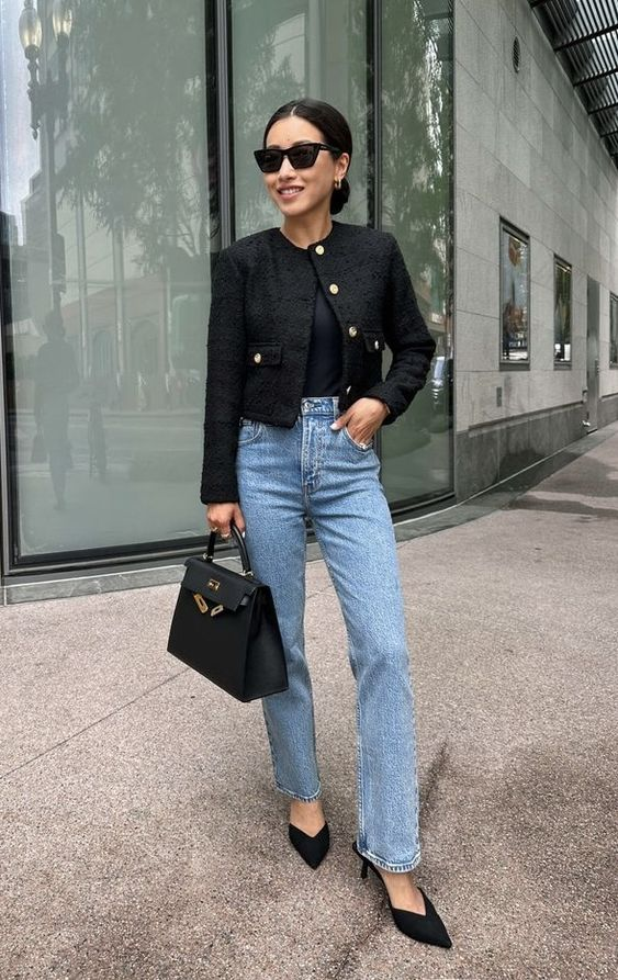This chic look effortlessly combines high-end and casual. The structured cropped black blazer with gold buttons adds a sophisticated touch, while the straight-leg jeans keep the look relaxed and modern. Paired with classic black pointed-toe heels and a sleek black handbag, this outfit is perfect for casual business meetings or a polished day out. The black sunglasses complete the ensemble, giving it an extra touch of elegance and confidence.