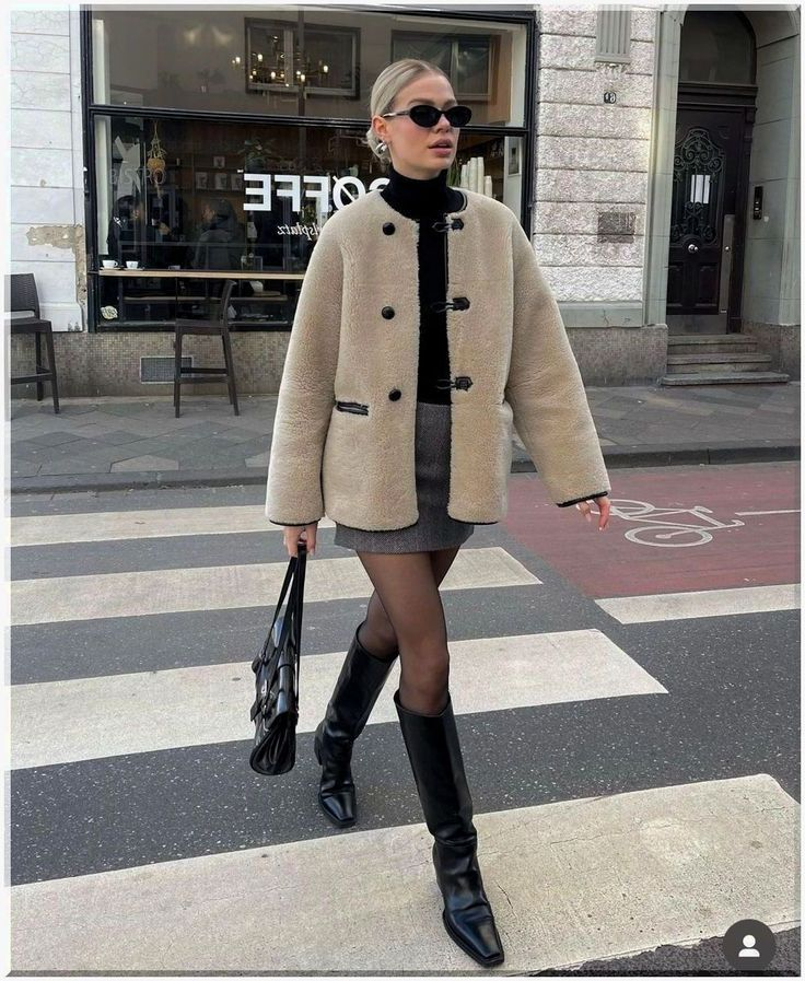 Stay cozy and chic with this oversized teddy coat paired with a sleek mini skirt. The beige coat adds warmth and texture, while the fitted turtleneck and grey skirt keep the look polished and put-together. Knee-high black boots and sheer tights add a touch of sophistication, making this outfit perfect for cooler fall days. Complete the look with a structured black handbag and statement sunglasses for a modern and stylish ensemble that’s perfect for a city stroll or casual meeting.