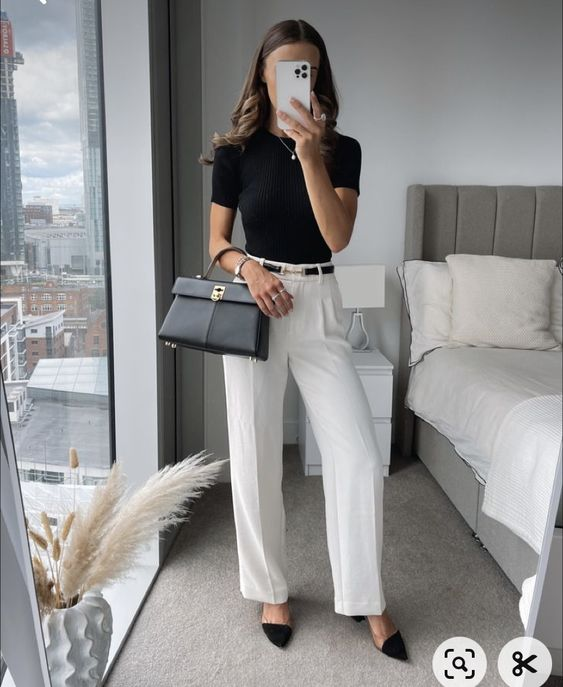 Sleek and modern, this black knit top paired with crisp white trousers creates a sophisticated monochrome look perfect for business casual settings. The slim black belt accentuates the waist, while pointed-toe heels and a structured black handbag add a polished touch. This minimalist ensemble is effortlessly chic and ideal for any professional or stylish occasion.