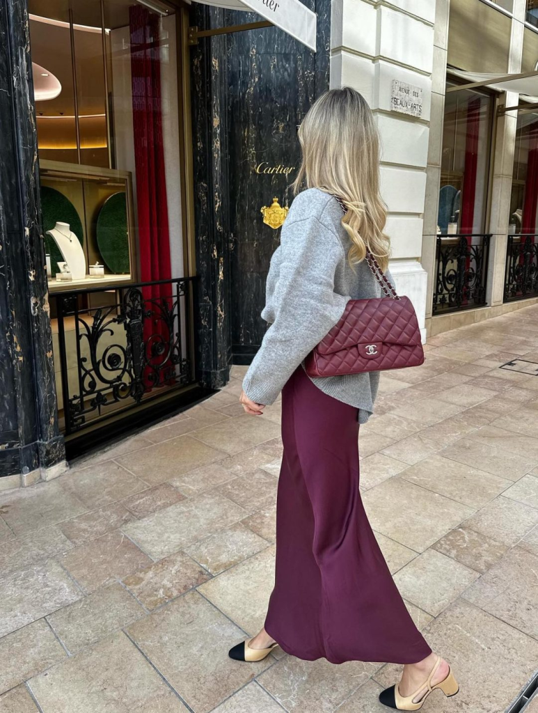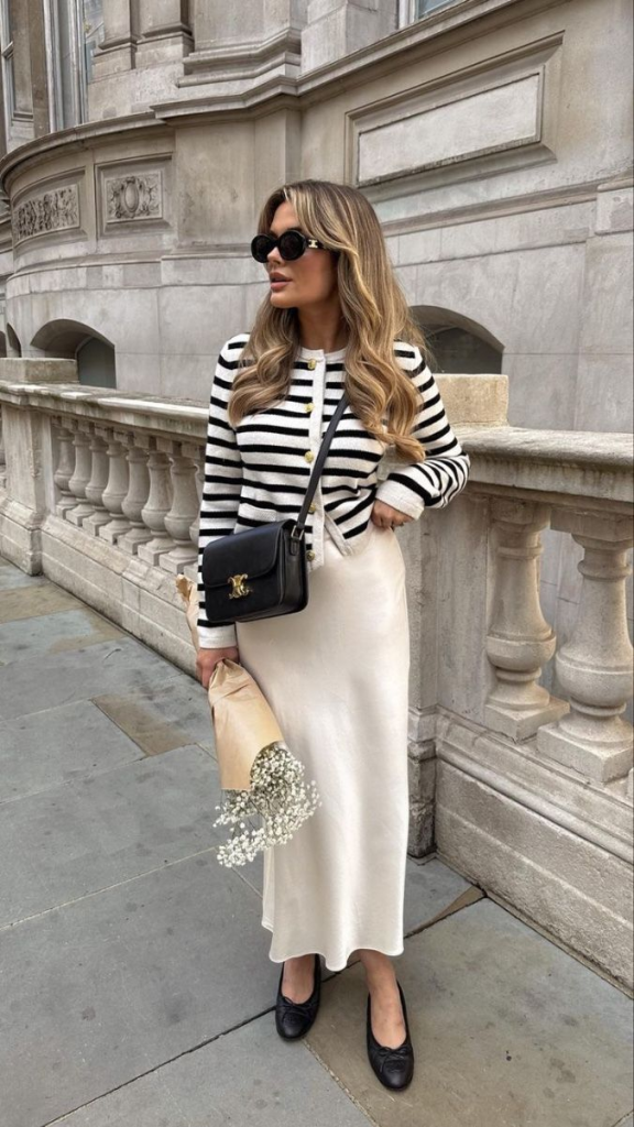 This elegant pairing of a striped cardigan with gold buttons and a flowing satin skirt creates a classic yet modern look. The soft sheen of the skirt adds a touch of luxury, while the black flats and structured crossbody bag keep the ensemble polished and practical. Perfect for a day out or a casual work setting, this outfit blends timeless Parisian chic with contemporary style.