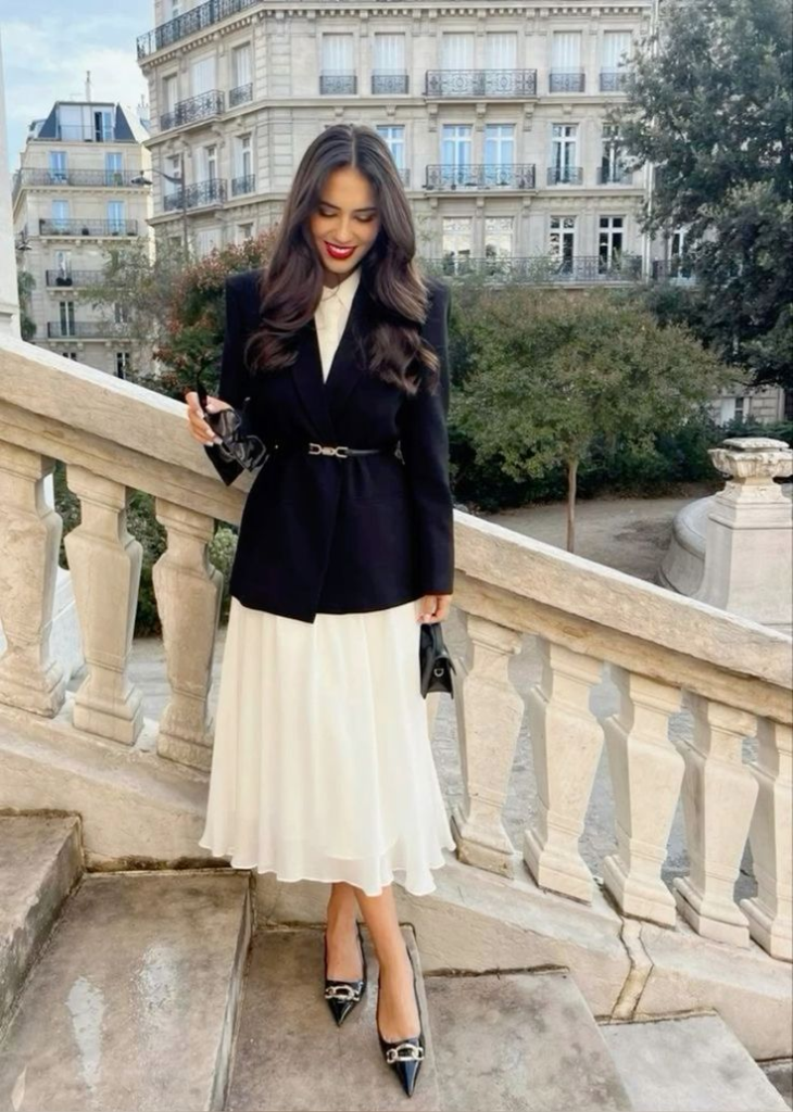 This stunning look combines a structured black belted blazer with a soft, flowing white midi skirt for the perfect balance of sharpness and grace. The sleek pointed-toe heels with metallic accents add a polished touch, while the bright red lip brings a pop of elegance to the ensemble. Ideal for formal settings or chic outings, this outfit exudes sophistication with a modern twist.