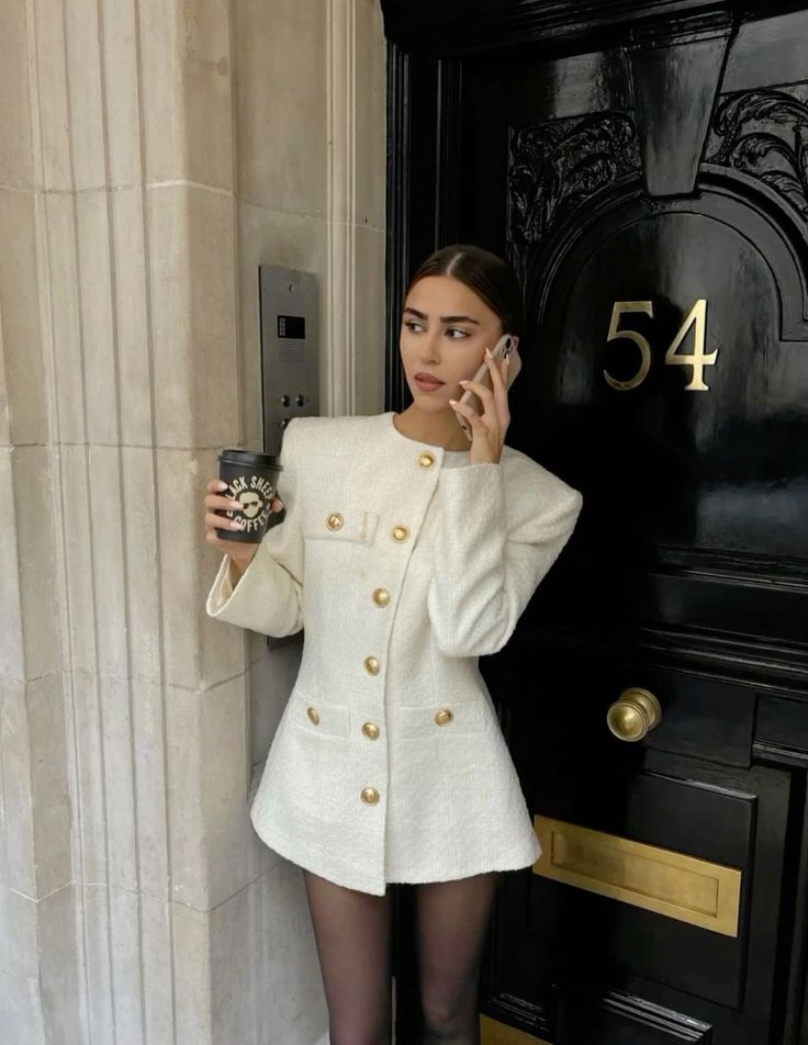 This chic structured white blazer with bold gold buttons offers a striking and sophisticated silhouette. The sharp tailoring and statement buttons exude luxury, while the minimalist design keeps the look modern and sleek. Perfect for day-to-night transitions, this outfit can be paired with sheer black tights for a polished finish, making it a versatile go-to for upscale events or professional settings.